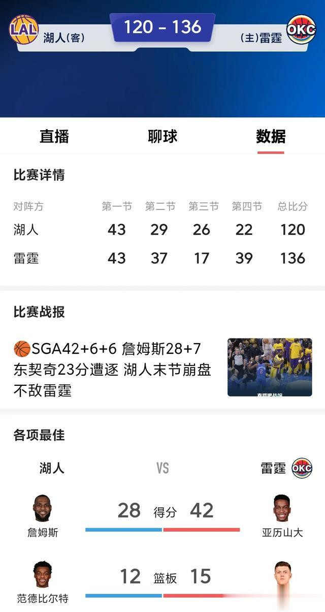 - 亚历山大42+6+6力助雷霆复仇湖人: 刷新老詹常规赛数据